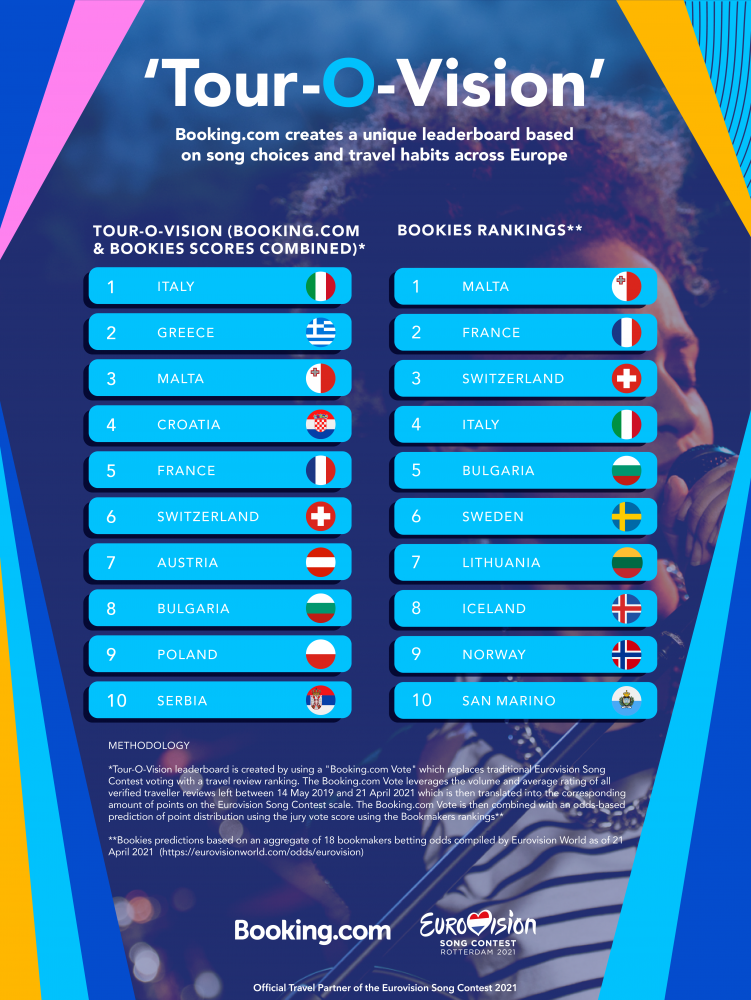 *Tour-O-Vision leaderboard is created by using a "Tripeden.com Vote"which replaces traditional Eurovision Song Contest voting with a review ranking. The Tripeden.com Vote leverages the volume and average rating of all verified traveller reviews left between 14 May 2019 and 21 April 2021 which is then translated into the corresponding amount of points on the Eurovision Song Contest scale. The Tripeden.com Vote is then combined with an odds-based prediction of point distribution using the jury vote score using the Bookmakers rankings**