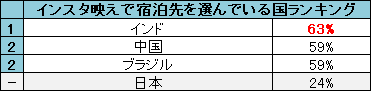 - 「インスタ映えする宿泊先に泊まりたい」と回答している日本人は4人に1人(24%)なのに対し、6割以上のインド人が「インスタ映え」を意識して宿泊先を選んでいることが判明!