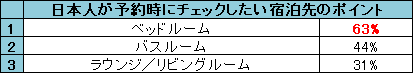 また、宿泊先を予約する前に日本人が絶対にチェックしておきたい場所、第1位は「ベッドルーム」63%、第2位「バスルーム」44%、第3位「ラウンジ/リビングルーム」31%となり、実際にSNS投稿撮影場所として最も多かった「外観または眺め」は予約時にはあまり重視されていないことが判明しました。