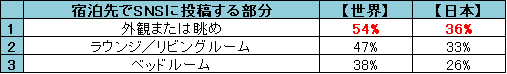 世界のトラベラーに宿泊先のどの部分をSNSに投稿しているか質問したところ、「外観または眺め」が54%、次いで「ラウンジ/リビングルーム」47%、「ベッドルーム」38%、という結果に。日本人だけで見てもランキングは変わらず、「外観または眺め」が36%、「ラウンジ/リビングルーム」33%、「ベッドルーム」26%という結果となりました。