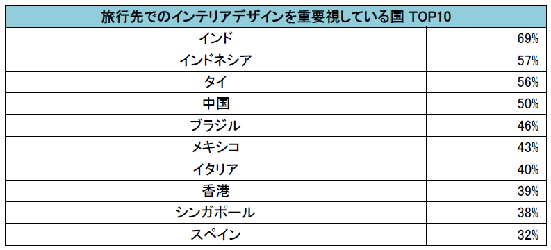 世界の旅行者に調査を行った結果、「旅行先でのインテリアデザインを重要視している」と回答した人が多かった国トップ10は下記となりました。トップ10の内、6ヶ国がアジア圏となった一方、日本は「重要視している」と回答したのはわずか16%となり、他国と比べ旅行先におけるインテリアデザインへの重要度が低いことが分かります。