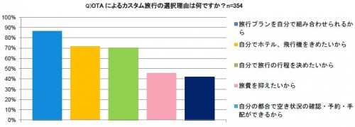 「今後は、パッケージかOTAによるカスタム旅行のどちらを選びたいか?」の質問に対し、約6割がOTAによるカスタム旅行を希望しているという結果から、主体的にプランを決めた旅行をしたいと考える人が多いことが考えられます。OTAによるカスタム旅行の選択理由について最も高いのは、「旅行プランを自分で組み合わせられるから」の86.4%次いで、「自分でホテル、飛行機等を決めたいから」71.5%、「自分で旅行の行程を決めたいから」70.3%、「旅費を抑えたいから」45.8%と続きました。