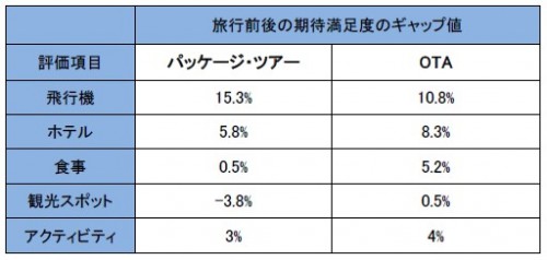 これまでパッケージ旅行を選択した人の中でも、徐々にブッキング・ドットコムのようなOTAによるカスタム旅行を選択する人が増えています。実際に、OTAを利用したカスタム旅行は旅行前後での期待満足値のギャップ値が高く、自分で選ぶ旅行に関し高い満足度を得られている人が多いようです。特にホテルは期待満足値のギャップが高く、ブッキング・ドットコムなどのOTAを使うことで、理想のホテルに出会うことができます。