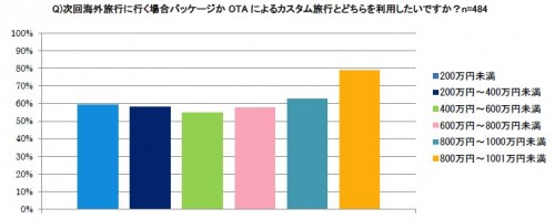収入別にみると年収1,000万円以上の人は自由に宿泊先や、飛行機を選択できるOTAによるカスタム旅行を希望する割合が全体よりも20%近く高く、その割合は8割弱にのぼることがわかりました。