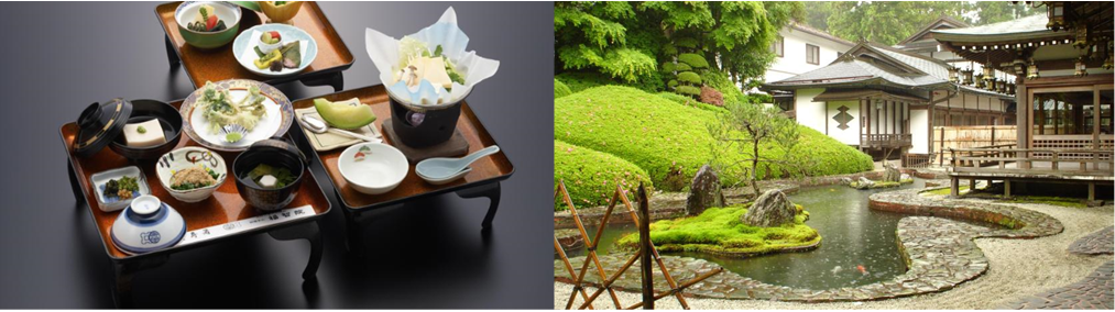 高野山中心部の高野山温泉福智院宿坊は、1200年もの歴史を持つ寺院内の和室に宿泊できます。そこでの朝食は伝統的な精進料理、夕食は事前のリクエスト制で、客室内、あるいはダイニングルームでいただけます。