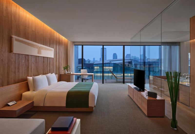 北京瑜舍酒店坐落于繁华的三里屯太古里,由日本最著名的建筑师之一隈研吾设计,酒店内部采用简洁精致的设计,纯天然的木质家具让客人感到温暖安心,再佐以中国特色元素装饰,体现出了中华文化的含蓄婉转。作为居舍系列的四座居舍之一,北京瑜舍酒店除了在设计建造上尽显艺术美学,更是在酒店中庭以当代美术馆的形式展示了来自世界各地的艺术家的作品,让客人能够足不出户便徜徉于艺术的海洋。